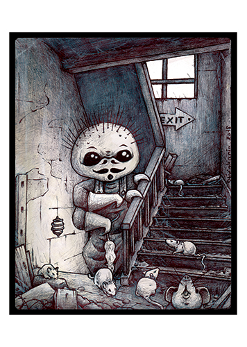 • Dessin au stylo bille noir sur papier A4 collé sur fond noir
