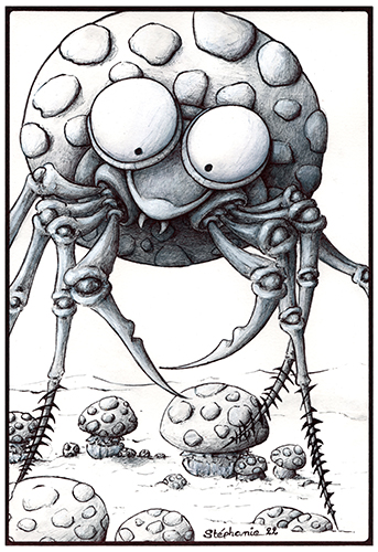 J'élabore principalement des illustrations et des peintures mettant en scène des personnages et des monstres attendrissants ou pas dans des décors imaginés ou existants.