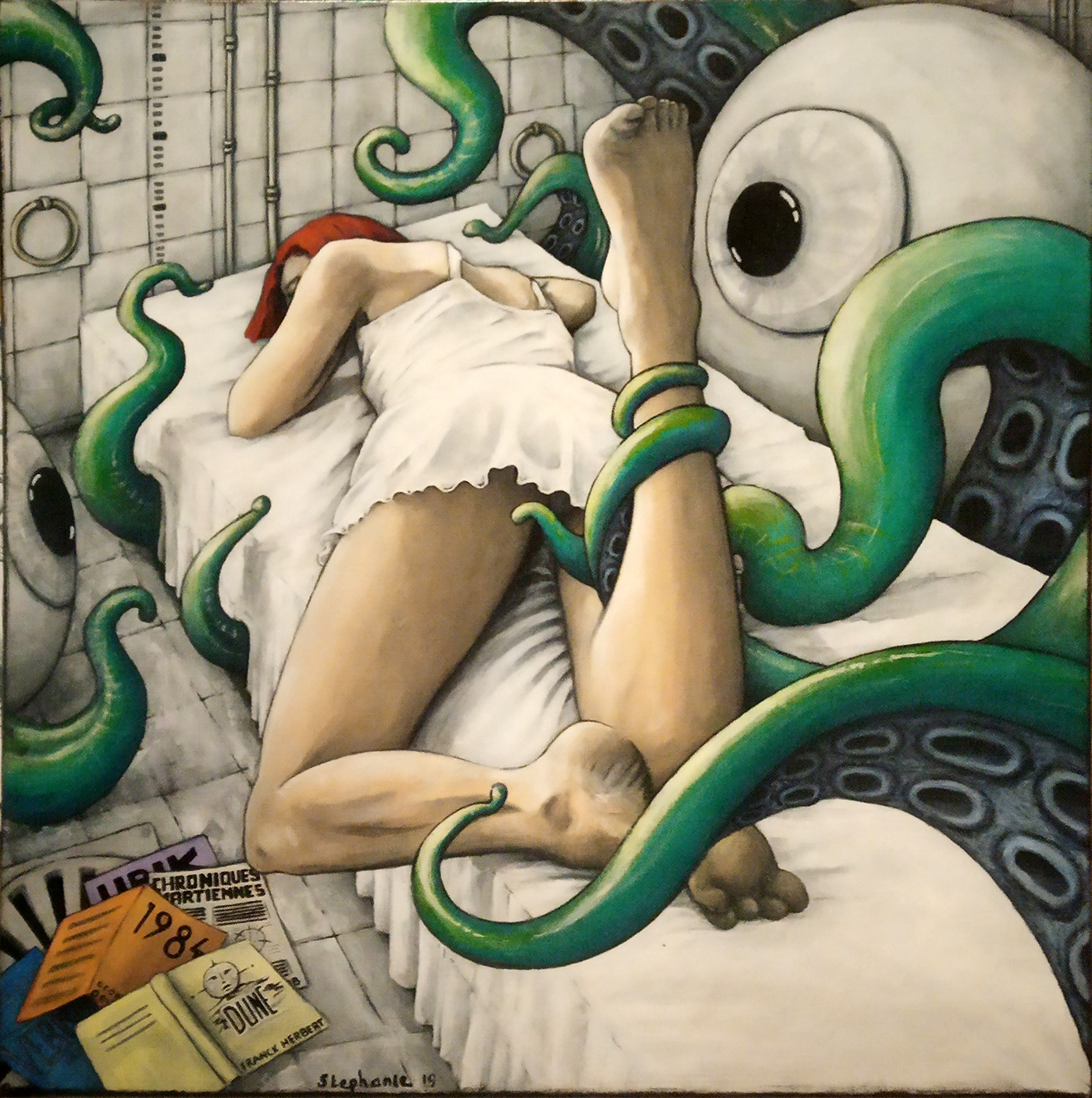 J'expose une toile (acrylique 60x60 cm) et quelques illustrations réalisées au stylo bille (format A5 sous-verre) à La Forêt des Livres, librairie atypique dans un lieux magnifique Xonrupt-longemer, pour les curieux, amoureux et collectionneurs de livres.