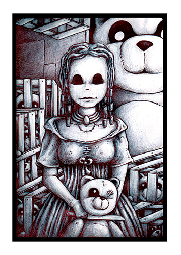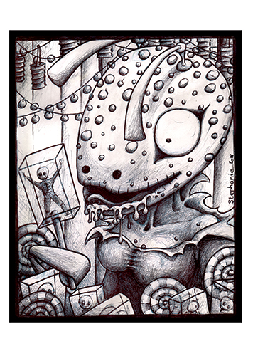 • Dessin au stylo bille noir sur papier A4 collé sur fond noir
